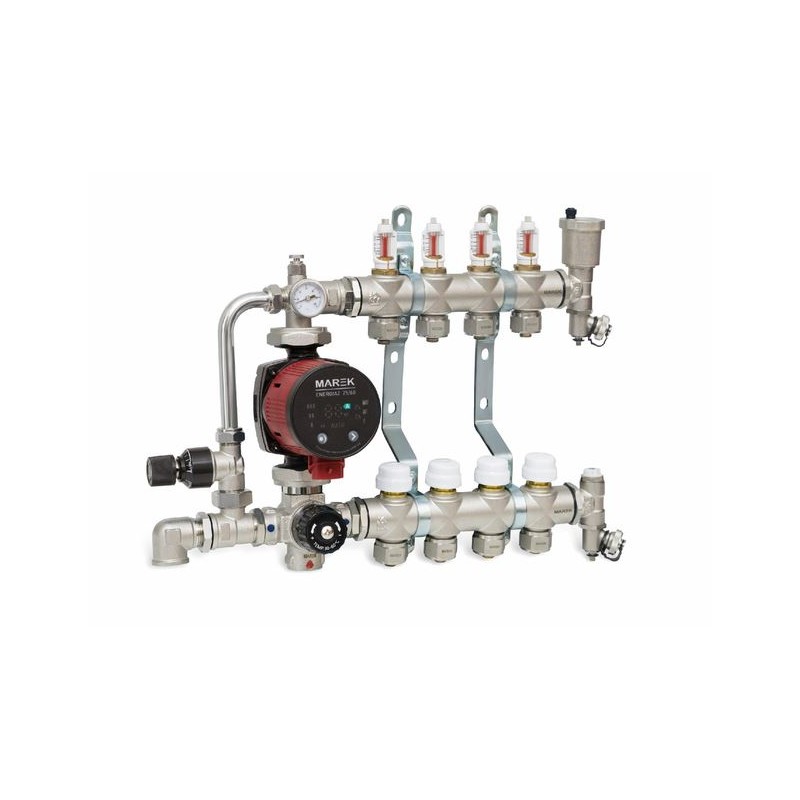 Комплект для теплої підлоги Marek – готове рішення для підключення теплої підлоги. Складається з: колекторна група з витратомірами та євроконусами, змішувальний вузол з термостатичним клапаном та байпасом, циркуляційний енергоефективний насос ENERGIA2 25/60 130 мм, кінцевики з ручним та автоматичним відвідником повітря. Комплекти доступні від 3 до 8 виходів.